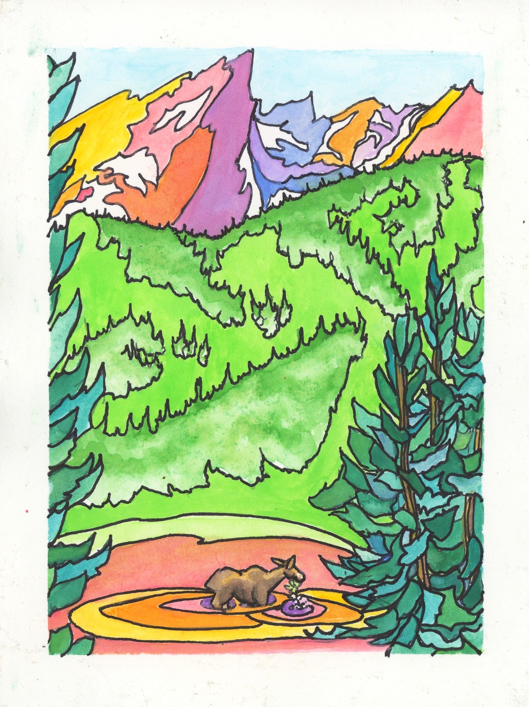 Watercolor and black ink pen, 6" x 8" on thick and sturdy hot press watercolor paper.